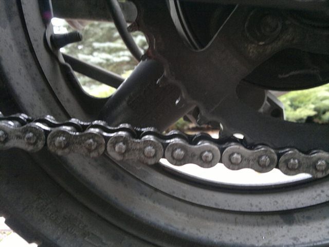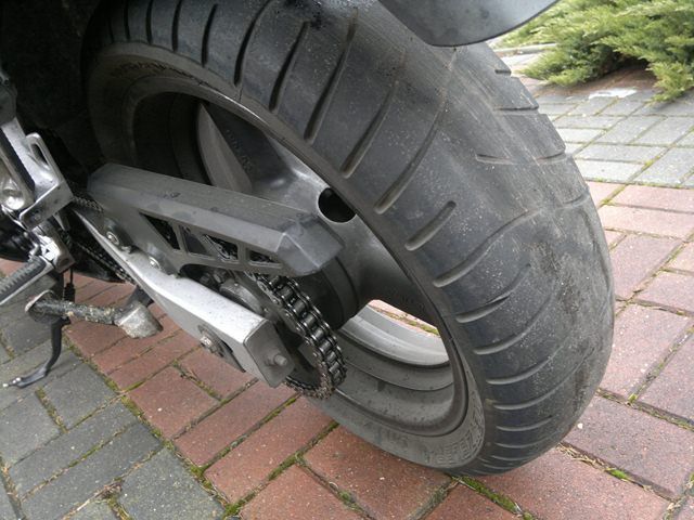 Jeżeli jesteśmy posiadaczami motocykla napędzanego łańcuchem, należy sprawdzić jego naciąg. Luz zazwyczaj powinien wynosić 2 – 3 cm i sprawdza się go przez odciągnięcie łańcucha w dół w połowie jego długości przy motocyklu wyprostowanym (nie na stopce bocznej) i przy różnych pozycjach koła. Zbyt luźny łańcuch w początkowej fazie psucia się ograniczy moc jednośladu i będzie niszczył zębatki, a krańcowo wykończony może nawet zerwać się i spaść robiąc komuś krzywdę. Typowym objawem niesprawnego napędu jest grzechotanie podczas pracy i rdzawy nalot. Długo i intensywnie używany za luźny lub uszkodzony łańcuch mógł powyginać lub powyszczerbiać zębatki. W takiej sytuacji należy je wymienić razem z łańcuchem, tak by jedne o drugie nie uszkadzały się coraz bardziej, generując niepotrzebne koszty. Gdy łańcuch jest już sprawdzony, należy rozprowadzić na nim specjalny preparat.